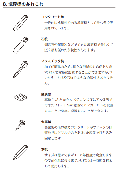境界標は御影石、コンクリート、プラスチックなどの材質でできた杭で頭部に十字や