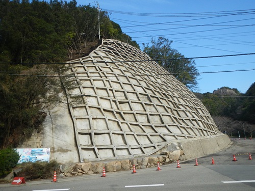斜面上に格子状のモルタル・コンクリートを造成し、斜面の安定を図る工法。